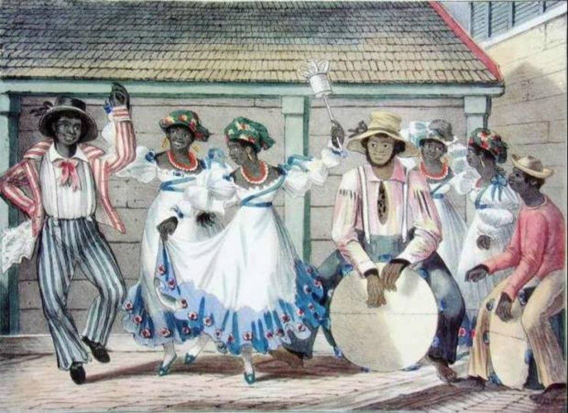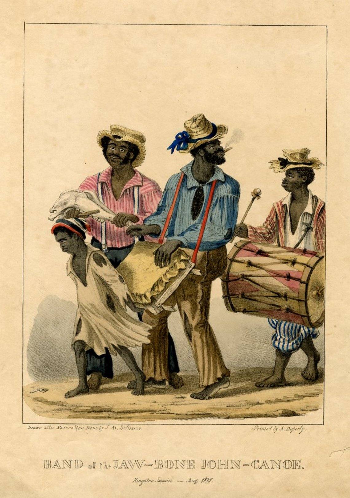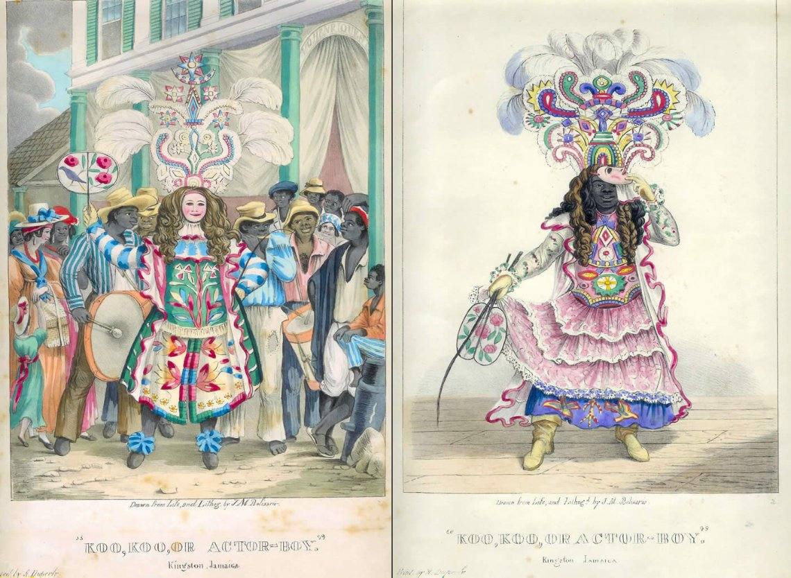 On the walls of homes and buildings in Jamaica today are prints by Isaac Mendes Belisario. His depictions of characters in the seasonal masquerade tradition of ‘Jonkonnu’ or ‘John Canoe’ created between 1837-38. Jonkonnu is derived from the West African masquerade traditions of Egun, as well as a mimicry of colonial class by the working class of the period.
