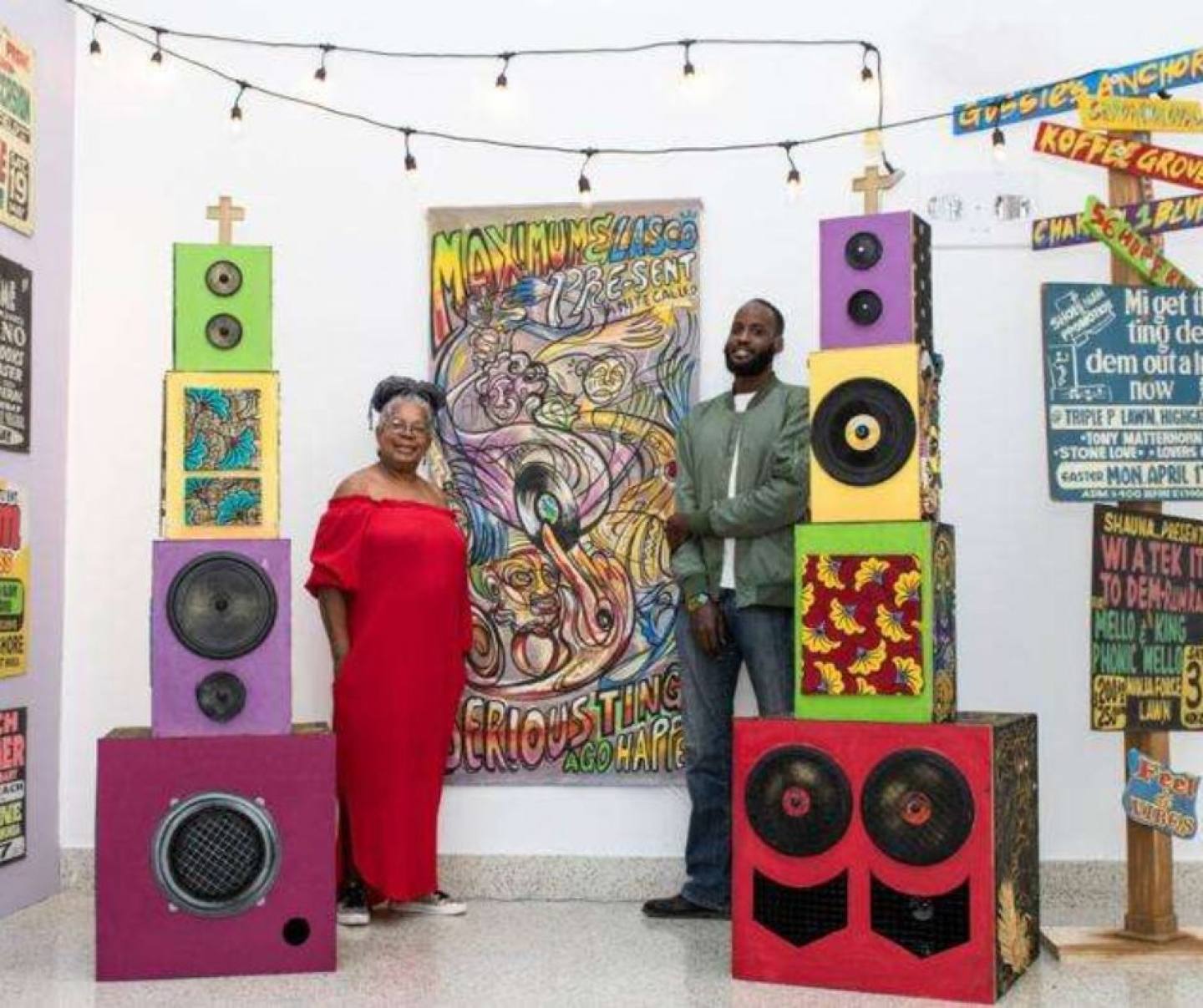 Working together, Walters and McCarthy's combined sensibilities and their love of dancehall typography, created fun, exciting pieces which showcase the feel of Jamaica's popular music.Their vibrant booths both featured mural-like paintings by McCarthy as well as large and mini hand-painted active speakers which generated dancehall and reggae beats. Walters' impressive collection of dancehall street signs draped the walls of the booth and a colourful hand-painted 'Ludi' board got a lot of action from adults and children alike. The warm reception lured audiences to the booth and enthralled a steady crowd of art enthusiasts.