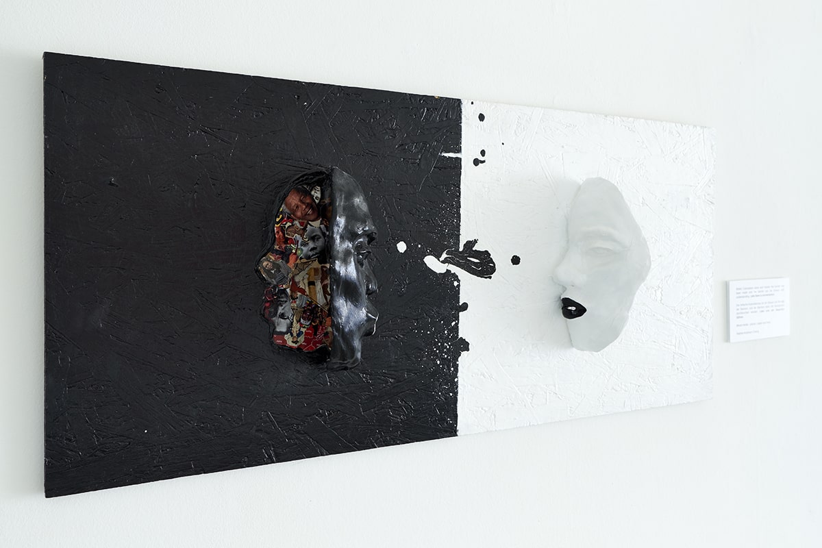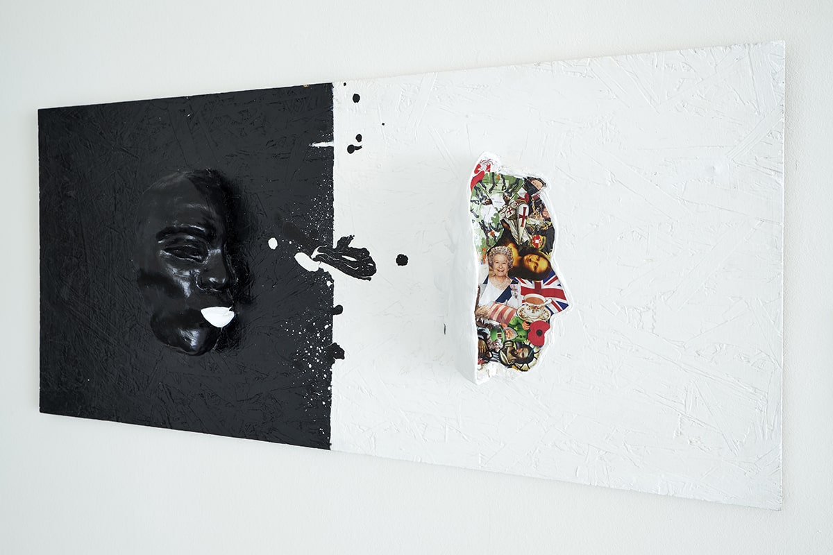91x45cm Mixed media- paper collage, plaster mask mounted on chipboard. Colonialism the racial divide