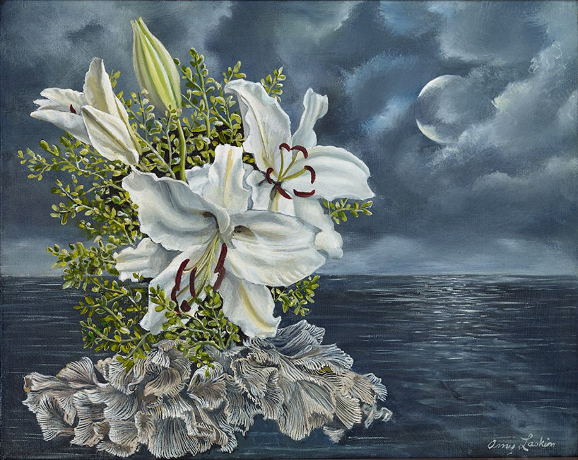 Signed giclee print, 20.3x 25. a moonlit sky, a floating coral and a floral entity in the calm of the sea.