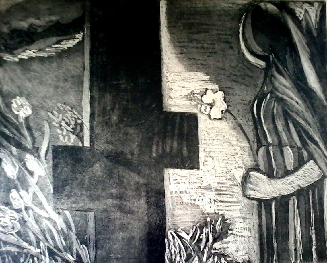 Etching- aquatint on BFK reeves 46x70cm. Morning Visitor alludes to figure who go bravely through the dark night to arrive at the place where consciousness is elevated by lessons from the journey
