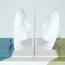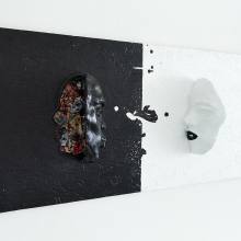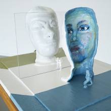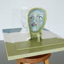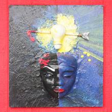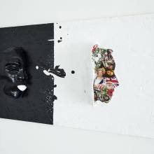 Mixed media, paper plaster mask mounted on wood 54 x 62 cm