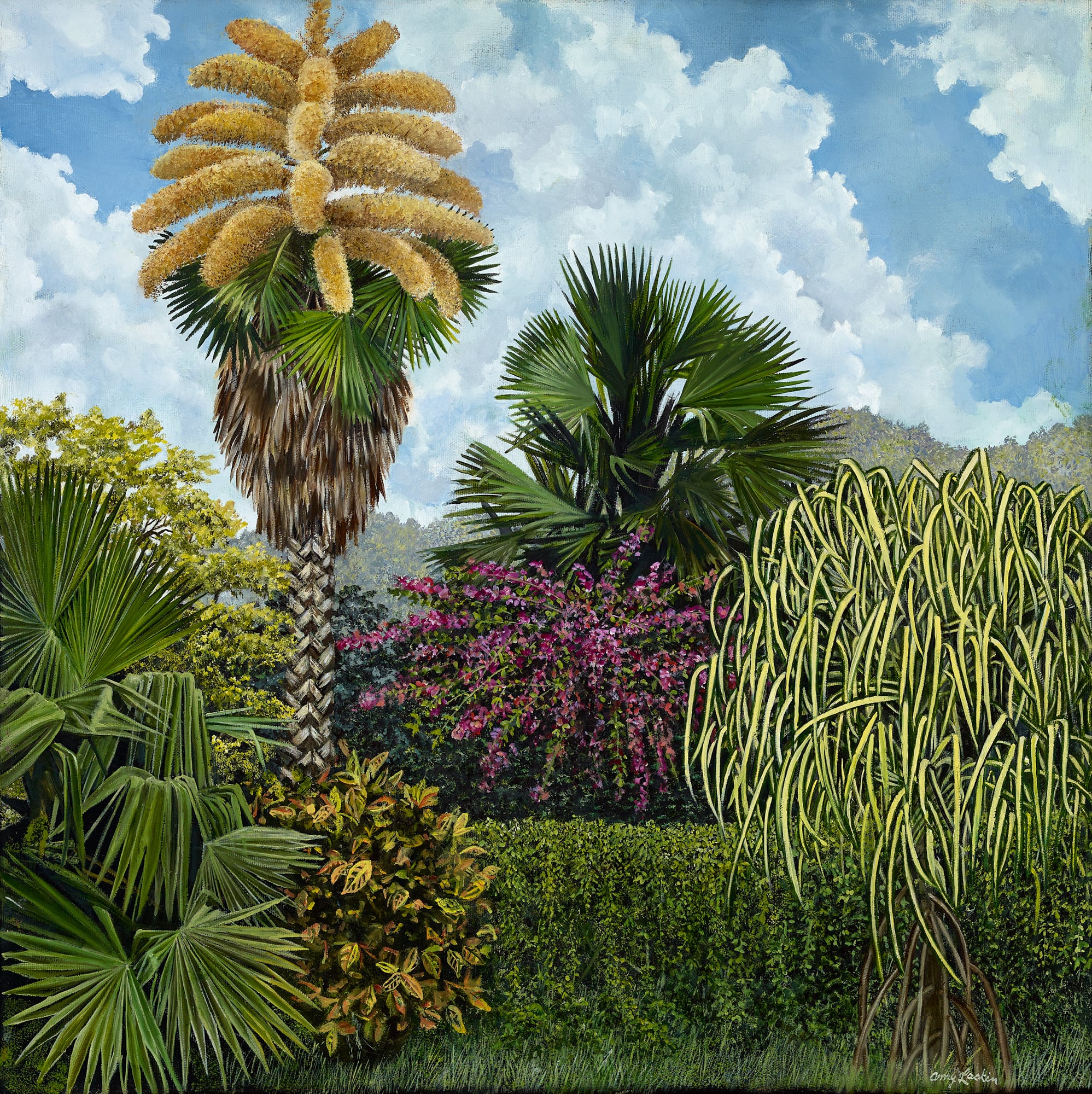 Hand signed Giclee print, 63.5x63.5 cm. Inspired by the rare bloom of the Century Palm tree at the Hope Botanical Gardens in Kingston. Jamaica