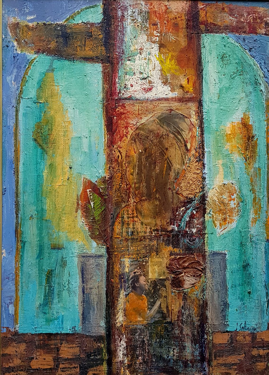 Acrylic with collage on canvas; 70.1 x 50.0 cm. Past to Present, at the centre of this drama of events is self portraits surrounded by textures and organic materials collaged to the surface of canvas. The simple arched shape adds a spatial dimension to the composition. The early 90’s were personally challenging yet creative times when even the asymmetrical balance of vertical and horizontal were welcomed.