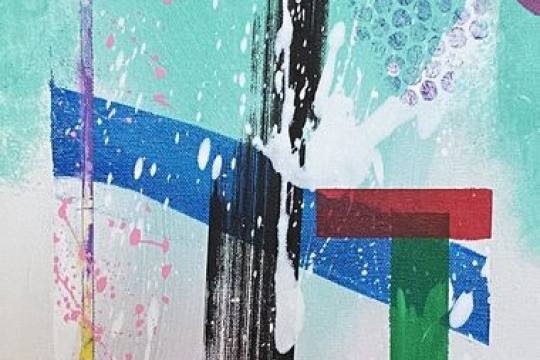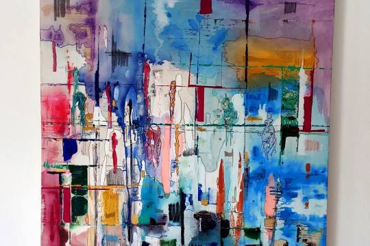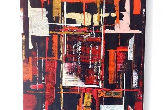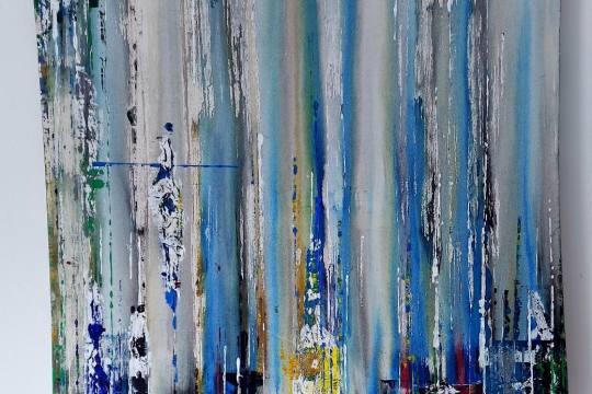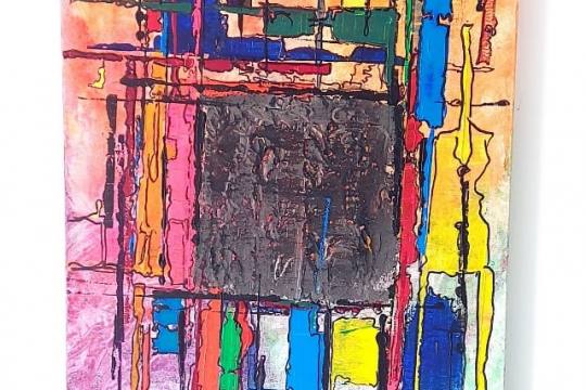 Paint on acrylic canvas with diverse materials 102x51cm. Homage to Rainbow Lives, honour the lives of friends and contemporaries who exited suddenly life as we know it.