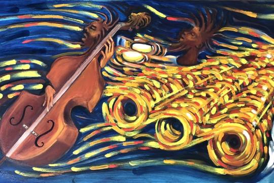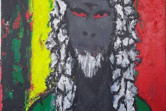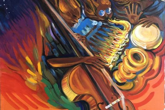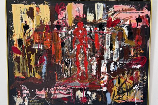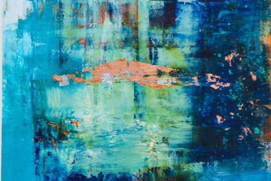Oil and mixed media on Arches paper, 25.4x17.8 cm, framed with green/blue matte and black frame, 35.5x43.2 cm