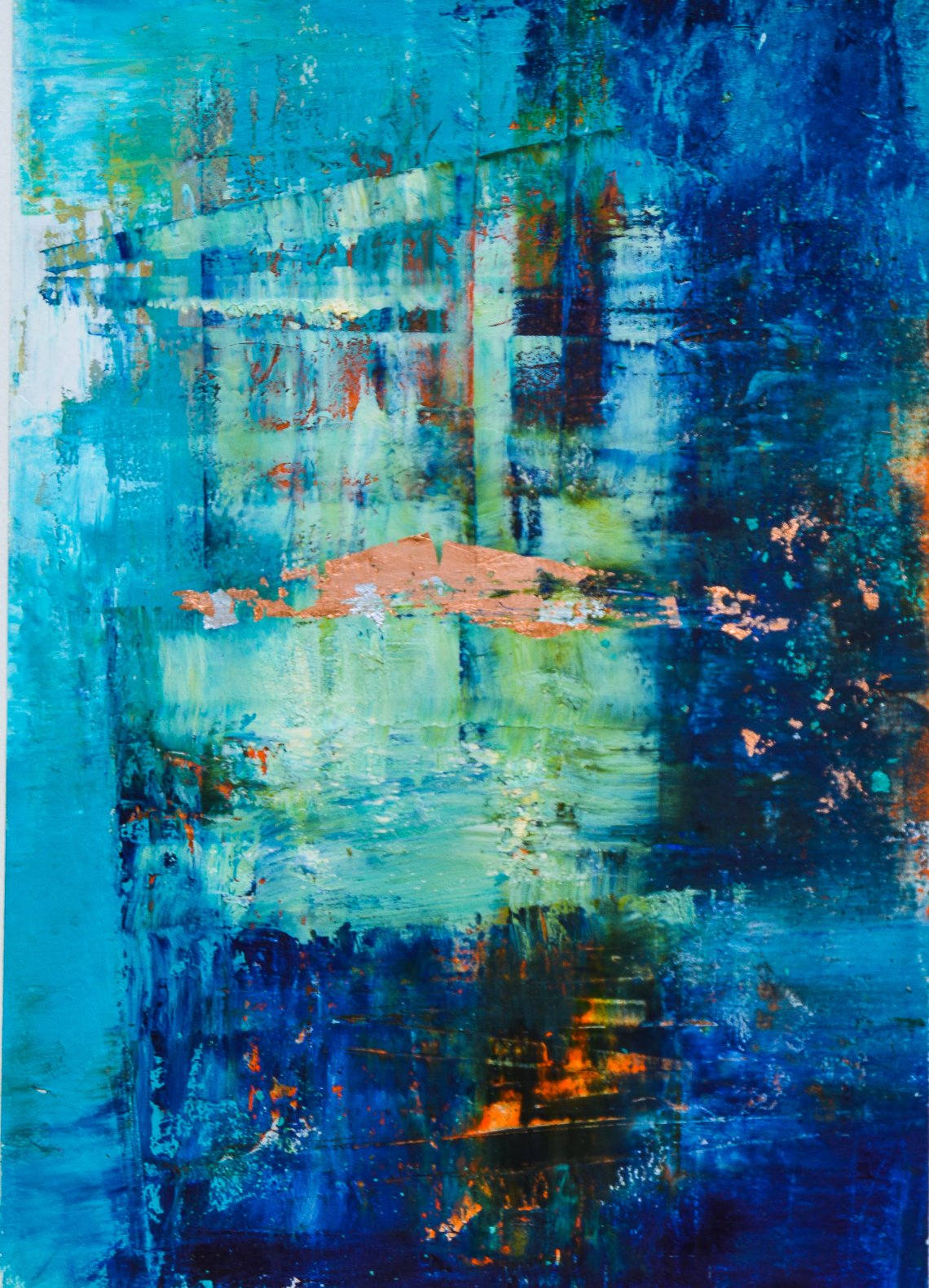 Oil and mixed media on Arches paper, 25.4x17.8 cm, framed with green/blue matte and black frame, 35.5x43.2 cm