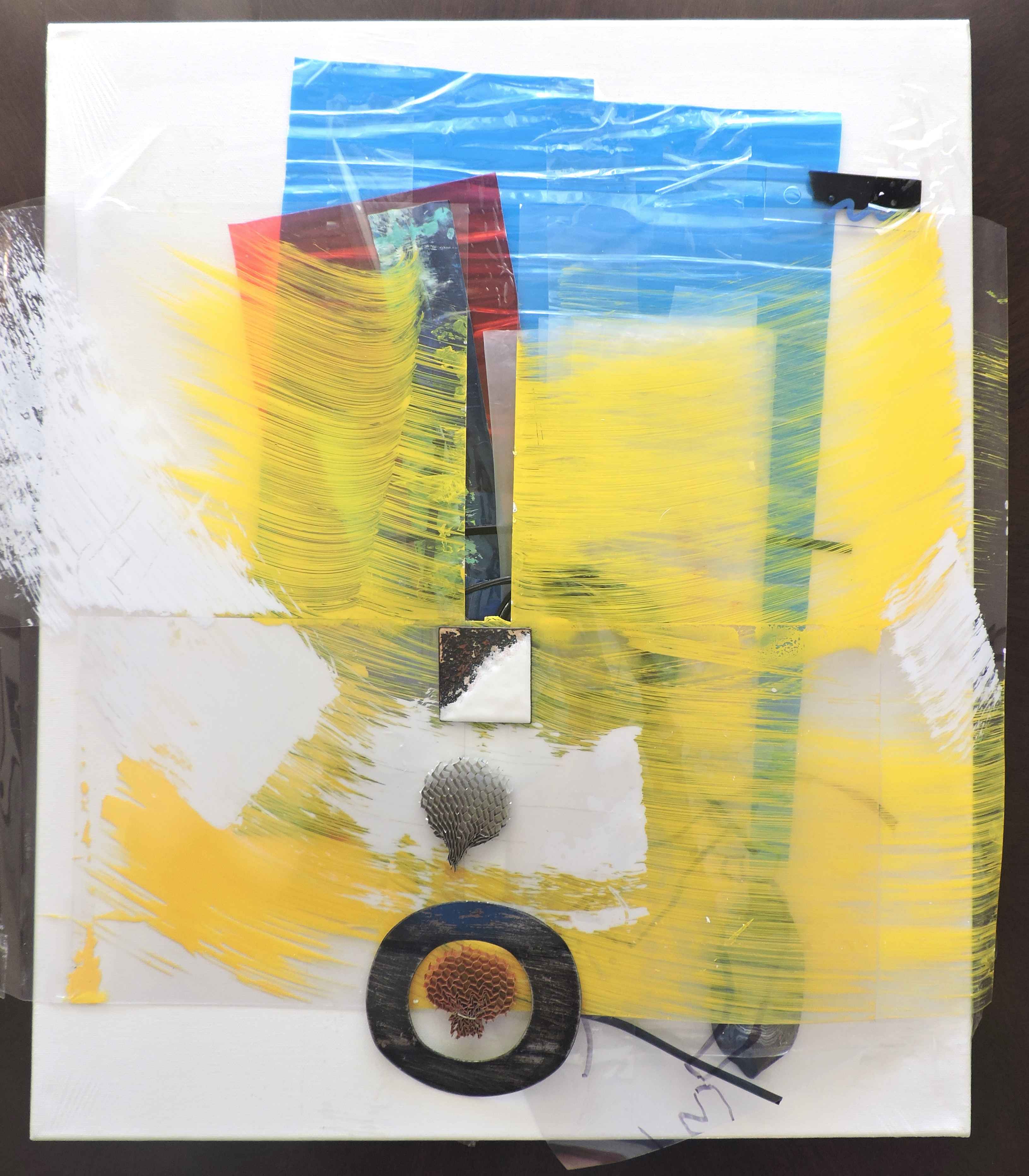 acrylic on transparent film, aluminum honeycoomb (used in airplane), polyurethane on canvas, 51x61 cm
